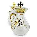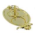 Coppia di ampolline in vetro soffiato con decori dorati e vassoio in ottone dorato con manici che fungono da piedini di appoggio.