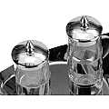 Ampolline in vetro con tappo e vassoio in metallo argentato.