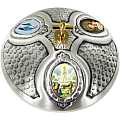 Questa pisside semplice ma nello stesso tempo è pregiata in quanto si presenta in ottone con argento antico e cesellata a mano con delicati particolari. La coppa in ottone dorato con oro fino è con un coperchio in ottone ricoperto di argento antico e con tre immagini resinate rappresentanti la Madonna di Fatima, Sant'Antonio e la Vergine Miracolosa. // Queste resine possono essero personalizzate con alcuni altri soggetti // Sul coperchio vi è una piccola crocetta di cm 2 // L'altezza della pisside è di cm 12 // Realizzato in Italia.