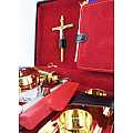 Valigia per celebrazioni: Servizio completo da altare con 15 oggetti. Astuccio di lusso con l'interno scamosciato, da viaggio con dimensioni ridottissime (14 x 20 x 5 cm). Rifinito con cura e con oggetti particolari (ampolle ermetiche, calicetto componibile, piccola patena, altarino, scatola per particole, tovaglie ricamate, stoletta...). Realizzato in Italia.
