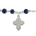 Braccialetto con palline in vetro maculato di diametro 6 mm di colore blu e croce di altezza 2 cm.