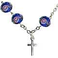 Braccialetto con grani in vetro pressato sfaccettato di colore blu con fiori rilegato in argento.