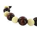Braccialetto elastico con grani lucidi in legno a due colori alternati (marrone scuro e creme/beige). Include anche una croce Tau che non è inserita come pendente, ma aderisce al polso.