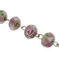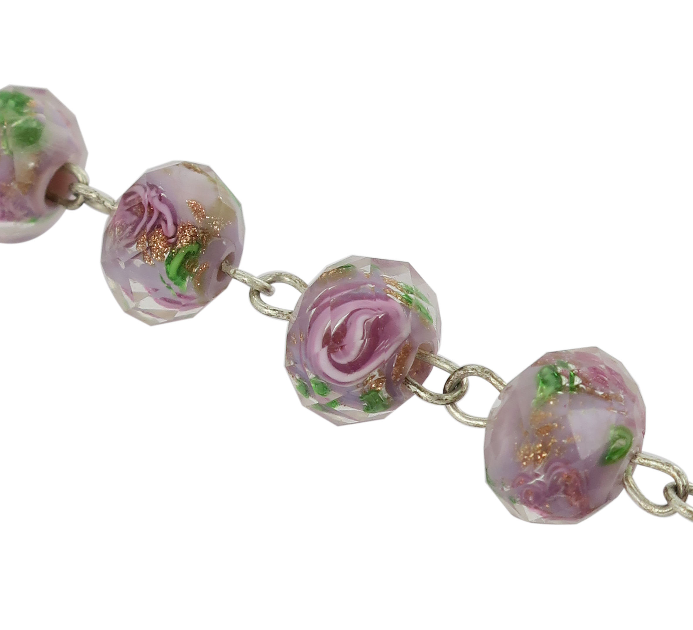 Braccialetto con grani di diametro 7 mm in vetro sfaccettato di colore viola/ametista con fiori di colore rosa.