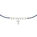 Girocollo realizzato in ecopelle intrecciata di colore blu e parti in argento 925%,quali la chiusura,i ciondoli e la croce.