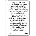 Questa immagine plastificata in PVC rappresenta la Madonna di Fatima. Sul retro c'è una preghiera in italiano a lei dedicata. La misura di questa card è di cm 5,5 x 8,5.