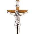 La croce è realizzata in legno di mogano, mentre il corpo di Cristo riportato è in metallo argentato. Il crocifisso puo eseere appeso grazie ad un gancio sul retro.