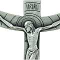 Questa croce di cm 14 in metallo argentato è in stile moderno con il Cristo stampato sulla croce dove sullo sfondo di essa vi sono i cerchi decorativi. Il braccio orizzontale della croce ha le punte rivolte verso il cielo per indirizzarci alla via della santificazione.