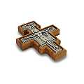 Croce pendente di San Damiano in metallo ossidato su legno d'ulivo, completa di cordone. Misure della croce: 4 x 3 cm. Realizzato in Italia.