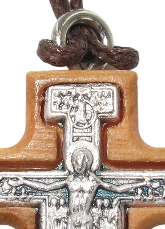 Croce pendente di San Damiano in metallo ossidato su legno d'ulivo, completa di cordoncino. Misure della croce: 2 x 1,6 cm. Realizzato in Italia.