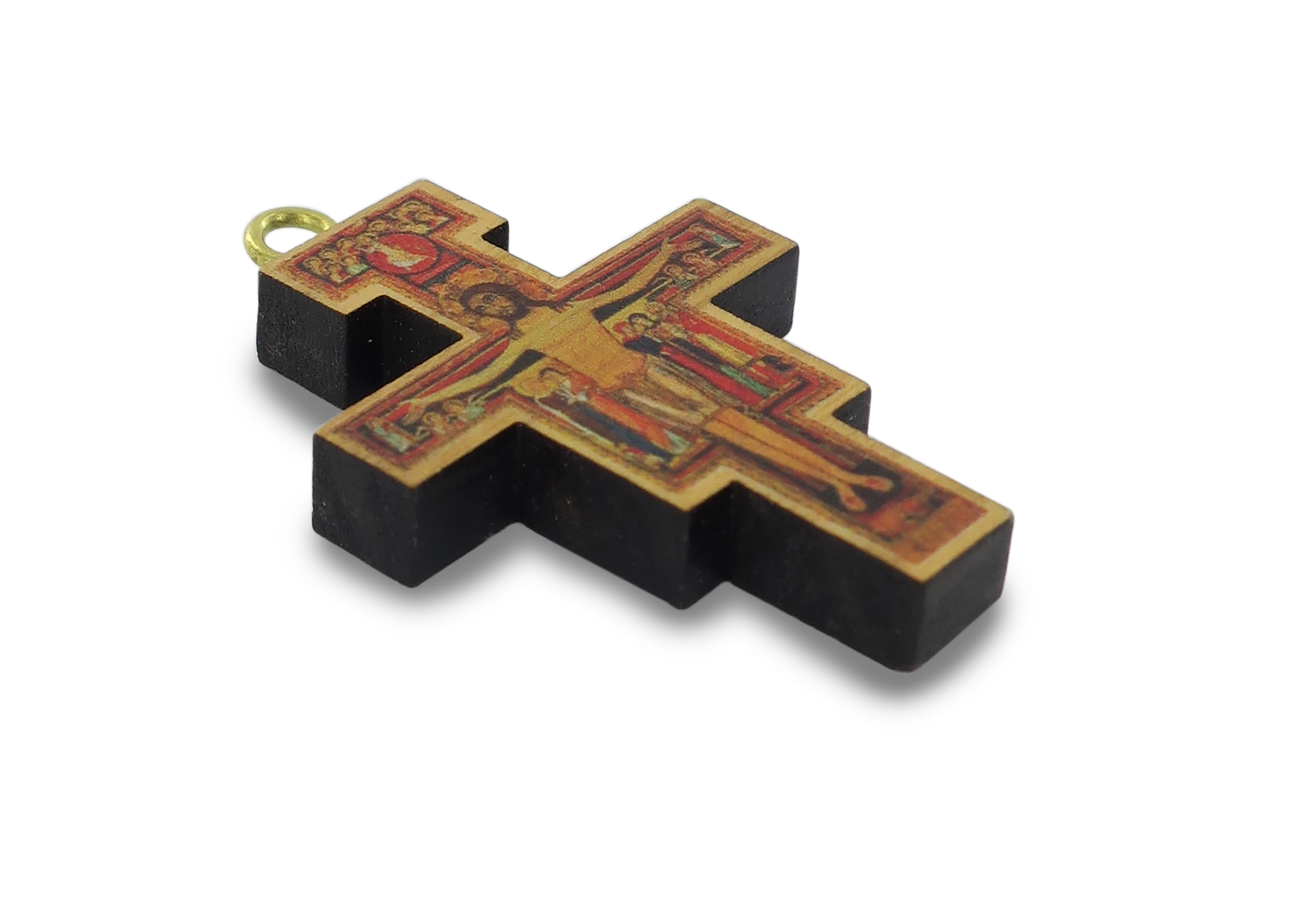 Croce pendente di San Damiano, completa di cordone. Si tratta di una stampa su legno d'ulivo. Misure della croce: 4 x 3 cm. Realizzato in Italia.