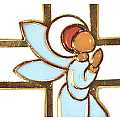 Originale croce realizzata in metallo con un angelo pregante in smalto azzurro.