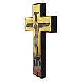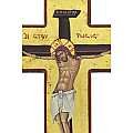 L'icona a forma di croce, profilata a mano in color bordeaux, celebra il Cristo morente. L'opera è una copia d'arte bizantina, realizzata con una litografia incollata su legno e rifinita a mano: lo sfondo, abbellito con foglia d'oro, è reso ancora più bello da scritte e aureole realizzate a mano di color rosso. La linea di questa croce lignea è molto netta e ben definita. Il gancio posteriore consente di appenderla al muro. Lo spessore della croce icona è tale da darle ancora più risalto quando appesa.