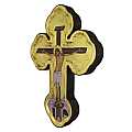 L'icona a forma di croce, dalle terminazioni trilobe, è profilata a mano in color bordeaux e celebra il Cristo morente. L'opera, una copia d'arte bizantina, è composta da una fine litografia incollata su legno e rifinita a mano: lo sfondo, impreziosito con foglia d'oro, è reso ancora più bello da scritte e aureole realizzate a mano di color rosso e da un effetto anticato. Lo spessore della croce icona, il suo bordo in rilievo dalla generosa smussatura e le sue estremità, che ricordano il trifoglio greco, fanno risaltare ulteriormente le forme e l'impatto visivo di questa croce da parete. Il gancio posteriore, infatti, consente di appenderla comodamente al muro.