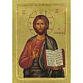 Icona da parete, di forma rettangolare, che raffigura Gesù Pantocratore. Si tratta di una copia d'arte bizantina: l'immagine di Cristo con il libro aperto e la mano benedicente è una fine litografia incollata su legno e rifinita con foglia d'oro, mentre le aureole, le scritte e i bordi sono realizzati a mano. Il bordo del quadretto, in rilievo con smussatura, funge da cornice alla rappresentazione. Il gancio sul retro consente di appendere l'icona al muro.