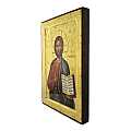 Grande icona da parete, di forma rettangolare, che raffigura Gesù Pantocratore. Si tratta di una copia d'arte bizantina: l'immagine di Cristo con il libro aperto e la mano benedicente è una fine litografia incollata su legno e rifinita con foglia d'oro, mentre le aureole, le scritte e i bordi sono realizzati a mano. Il bordo del quadretto, in rilievo con smussatura, funge da cornice alla rappresentazione. Il gancio sul retro consente di appendere l'icona al muro.