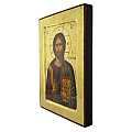 Icona da parete, di forma rettangolare, che raffigura il Cristo Pantocratore. Si tratta di una copia d'arte bizantina: l'immagine di Cristo con il libro chiuso e la mano benedicente è una fine litografia incollata su legno e rifinita con foglia d'oro, mentre le aureole, le scritte e i bordi sono realizzati a mano. Il bordo del quadretto è in rilievo con smussatura. Il gancio sul retro consente di appendere l'icona al muro.
