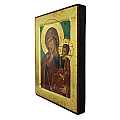 L'immagine è una fine litografia di una Madonna con Bambino, incollata su legno e rifinita con foglia d'oro, mentre le aureole, le scritte e i bordi sono realizzati a mano. Il bordo del quadretto è in rilievo con smussatura. Il gancio sul retro consente di appendere l'icona al muro.