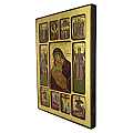Questa grande icona da parete di legno presenta 11 immagini diverse che raffigurano la Madonna di Vladimir, gli Arcangeli e una serie di episodi biblici che riguardano la Vergine Maria e il Signore. Il quadretto-icona è realizzato con litografie su carta incollate ad una tavola lignea, rifinite con numerose scritte, aureole e bordi bordeaux tracciati a mano. Lo sfondo è abbellito da una rifinitura in foglia d'oro che renderà questa tavoletta illustrata alta ben 40 cm ancora più bella e lucente. Un leggero effetto dona un aspetto anticato allo sfondo dell'icona. I colori predominanti, l'oro e il porpora, sono tipici dell'arte greco-bizantina e conferiscono luminosità e bellezza al quadretto.