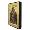 Icona da parete che raffigura la Sacra Famiglia. Si tratta di una copia d'arte bizantina: l'immagine è una fine litografia incollata su legno e rifinita con foglia d'oro, mentre le aureole, le scritte e i bordi sono realizzati a mano. il bordo in rilievo, smussato, fa da cornice alla rappresentazione. Il gancio sul retro consente di appendere l'icona alla parete.