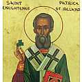 Icona da parete con bordo rosso, raffigurante San Patrizio (Saint Patrick), figura molto popolare della cristianità irlandese e santo patrono d'Irlanda, di Boston e di New York, celebrato in tutto il mondo il 17 marzo. S. Patrizio, considerato l'Evangelizzatore dell'Irlanda, è qui rappresentato in vesti di color verde, tiene in mano il simbolico trifoglio (elemento da lui adottato per spiegare il concetto di Trinità durante la sua opera di evangelizzazione) ed è definito con l'iscrizione "Enlightener of Ireland". Nella mano sinistra tiene, invece, il libro delle Sacre Scritture, simbolo della parola del Signore da lui professata.