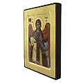 L'immagine è una fine litografia, incollata su legno e rifinita con foglia d'oro, mentre le aureole, le scritte e i bordi sono realizzati a mano. Indossa vesti sontuose e colorate, ricche di decori; nella rappresentazione, spiccano le ali molto grandi e dettagliate, di colore arancione e azzurro, in cui si distinguono chiaramente le piume. Il bordo del quadretto è in rilievo con smussatura e la superficie è abbellita da un effetto che dona un aspetto anticato alla superficie. Lo sfondo, di color oro brillante, dona ulteriore risalto ai soggetti della rappresentazione. Il gancio sul retro consente di appendere l'icona al muro.