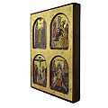 Questa icona da parete di legno presenta 4 immagini diverse che raffigurano episodi della vita di Gesù. Il quadretto-icona dell'altezza di 22 cm è realizzato con litografie incollate ad una tavola lignea, rifinite con scritte, aureole e bordi bordeaux tracciati a mano. Lo sfondo è abbellito da una rifinitura in foglia d'oro che renderà questa tavoletta ancora più bella e lucente. Un leggero effetto dona un aspetto anticato al manufatto.