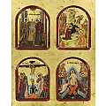 La serie di episodi della vita di Gesù includono l'Annunciazione, la Natività, la Crocifissione e la Resurrezione. Le varie immagini vengono esaltate dallo smussatura bordeaux che fa da contorno alle quattro sezioni incassate a forma d'arco in cui le figure trovano posto. Anche grazie a questa accortezza grafica, l'icona appare come un'opera multi-soggetto. Il gancio posteriore consente di appendere il quadretto al muro.