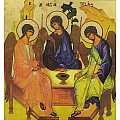 Grande icona da parete, di forma quasi quadrata, che raffigura la Trinità di Andrej Rublëv, dall'interpretazione incerta. Viene ricreata la visita di tre angeli ad Abramo, in cui gli fu fatta la promessa di una discendenza. Considerata "l'icona delle icone", è anche chiamata "Ospitalità di Abramo" ed è stata realizzata nel XV secolo. Molti studiosi interpretano le tre figure come la Trinità: a sinistra della rappresentazione ci sarebbe Dio Padre, Gesù sarebbe al centro e sulla destra viene identificato lo Spirito Santo. Nella figura è presente la coppa, metafora del sacrificio del Signore.