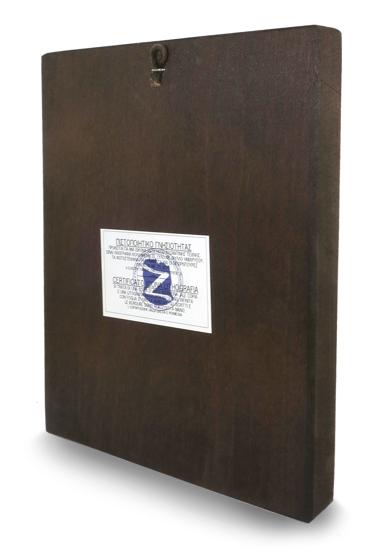 Il certificato sul retro attesta le caratteristiche di questa icona, realizzata in Grecia.
