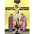 Icona raffigurante la Crocefissione di Gesù dipinta a mano secondo le tecniche bizantine. Le piccole imperfezioni che è possibile trovare sul manufatto sono la prova del lavoro svolto artigianalmente. Ai lati della croce, che domina l'immagine, sono raffigurati Maria e l'apostolo Giovanni al quale Gesù dalla croce offrì sua Madre per tutti noi dicendo: "Madre ecco tuo figlio, figlio ecco tua Madre" e da quel momento Giovanni la prese con se. Il corpo di Cristo, anche se in apparenza morto, in realtà emana una luce particolare che preannuncia cosi la Resurezzione.