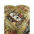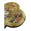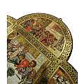 Croce in legno MDF con le 4 estremità arrotondate a semicerchio volte a delineare la forma caratteristica della Cristianità. La tavoletta a forma di croce è suddivisa in settori contornati da un intreccio decorativo color oro in cui sono raffigurate scene relative a Gesù Cristo. Le rappresentazioni sono stampe a colori (tra cui il color oro) su carta, poi applicate alla croce-icona in MDF.