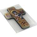 L'immagine è una stampa di carta lucida applicata su croce in legno, con finiture a caldo in color oro e color argento.