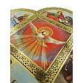 La parte quadrata centrale, più grande, mostra una colomba con aureola, con raggi che si propagano sullo sfondo di un forte rosso. A contorno, sono rappresentati i quattro Evangelisti con le loro simbologie: Marco con il leone, Luca con il bue, Giovanni con l'aquila e Matteo con l'uomo alato (o angelo). Ad attirare l'attenzione dello spettatore è il contrasto cromatico tra il quadro centrale e i delicati colori delle 4 rappresentazioni a semicerchio.