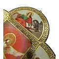 Croce in legno MDF con le 4 estremità arrotondate a semicerchio volte a delineare la forma caratteristica della Cristianità. La tavoletta a forma di croce è suddivisa in settori contornati da un intreccio decorativo color oro in cui sono raffigurati i quattro Evangelisti intendi a narrare la vita del Signore. Le rappresentazioni sono stampe a colori (tra cui il color oro) su carta, poi applicate alla croce-icona in MDF.