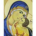 Tavola icona raffigurante la Madonna col Bambino in braccio. Questa immagine è una stampa su tavolo in legno con particolari dorati e blu.