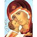 Tavola icona raffigurante la Madonna col Bambino in braccio. Questa immagine è una stampa su tavolo in legno con particolari dorati.