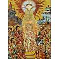 Questa tavola icona raffigura la Discesa dello Spirito Santo sugli Apostoli riuniti nel Cenacolo, in stile bizantino.