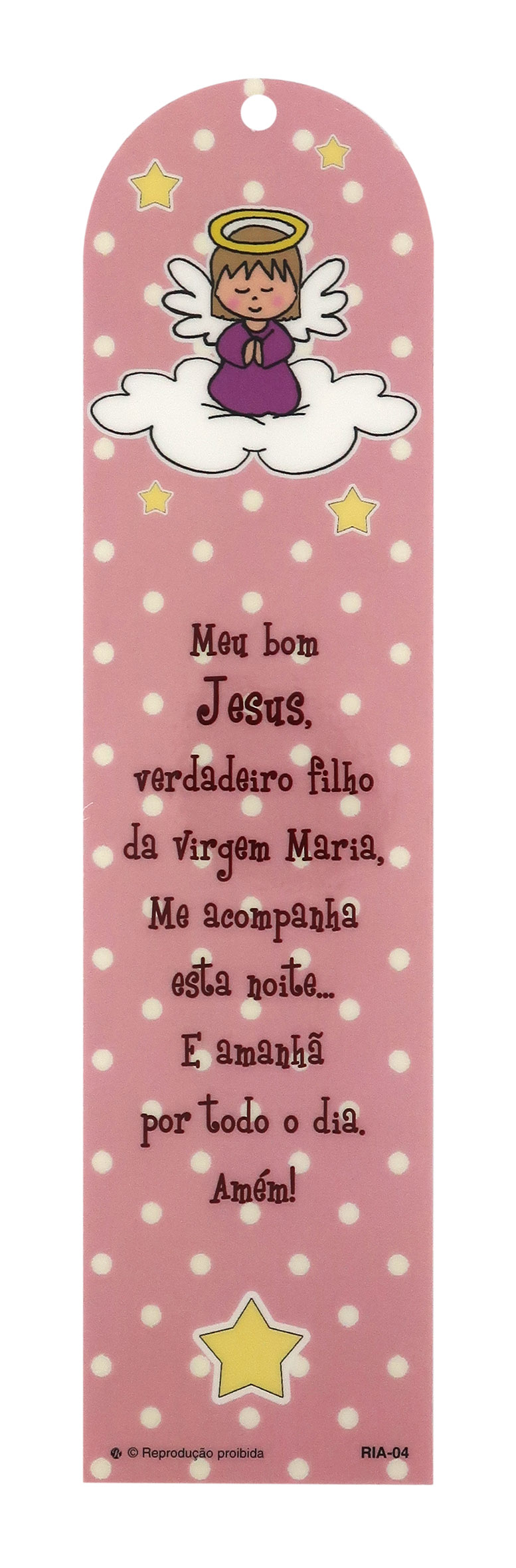 Segnalibro a forma di cupola con fiocchetto rosa e immagine dell'angelo custode e preghiera in portoghese.