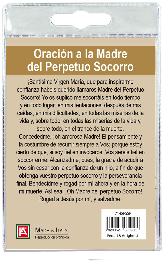Calamita in metallo nichelato raffigurante la Madonna del Perpetuo Soccorso con preghiera in spagnolo.