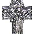 Croce da tavolo in metallo argentato con base in legno. Altezza della croce: 5 cm.