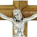 Croce in ulivo con Cristo riportato in metallo argentato - 8 cm
