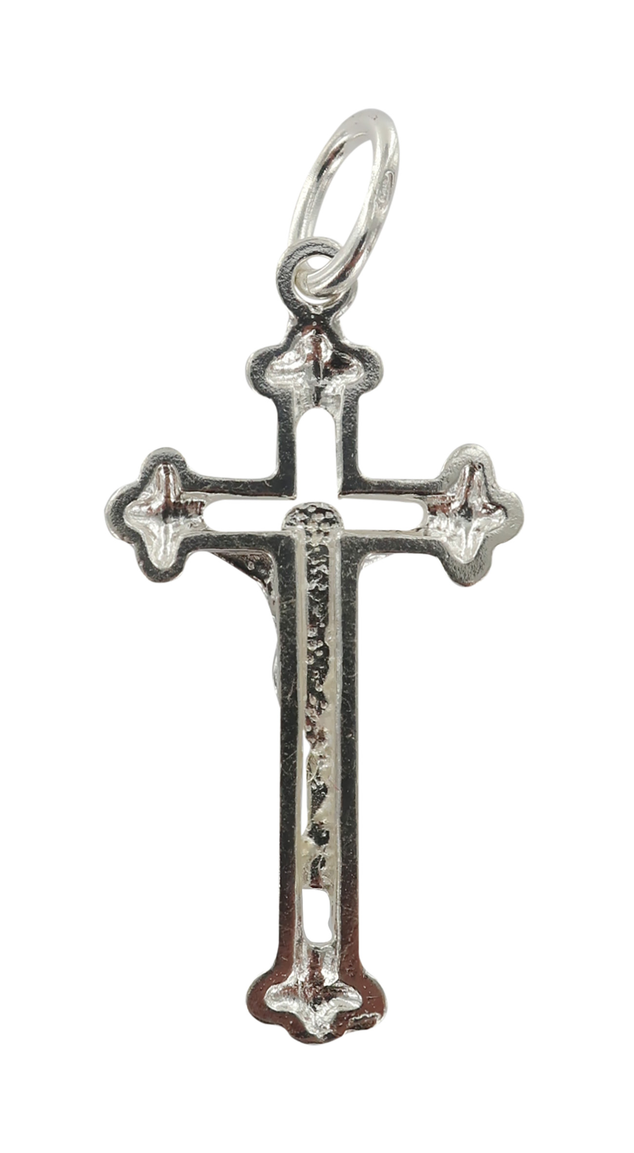 Croce traforata in argento 925 con Cristo riportato.