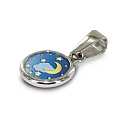La medaglietta di cm 1 rappresenta la luna con le stelle stampata su porcellana con sfondo di colore blù e incastonato in un profilo di argento lucido.