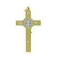 Croce di San Benedetto in ottone dorato lucido con sfondo in smalto rosso e con il corpo di Cristo in metallo argentato.