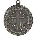 Medaglia raffigurante San Benedetto in metallo argentato ossidato. Altezza: 3 cm.