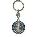 Portachiavi tondo a doppia faccia, raffigurante la Croce di San Benedetto su un lato e il santo sull'altro. Realizzato in metallo con smalto. La medaglia del portachiavi misura 3 cm. (diametro). Realizzato in Italia.