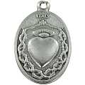 Medaglia ovale in metallo ossidato raffigurante in una faccia Gesù Bambino di Praga e sull'altra il cuore.