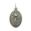 Medaglia ovale in metallo ossidato raffigurante la Sacra Famiglia da un lato e la Colomba che rappresenta lo Spirito Santo dall'altra. Misura: 2,5 x 1,5 cm.