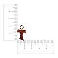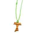 Croce tau pendente alta 1,5 cm (2 cm con gancettino) e larga 1,2 cm, in legno ulivo. Con laccio colorato.